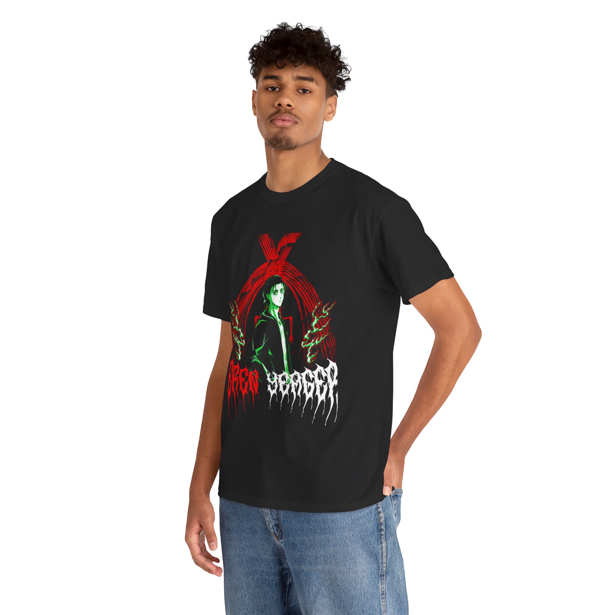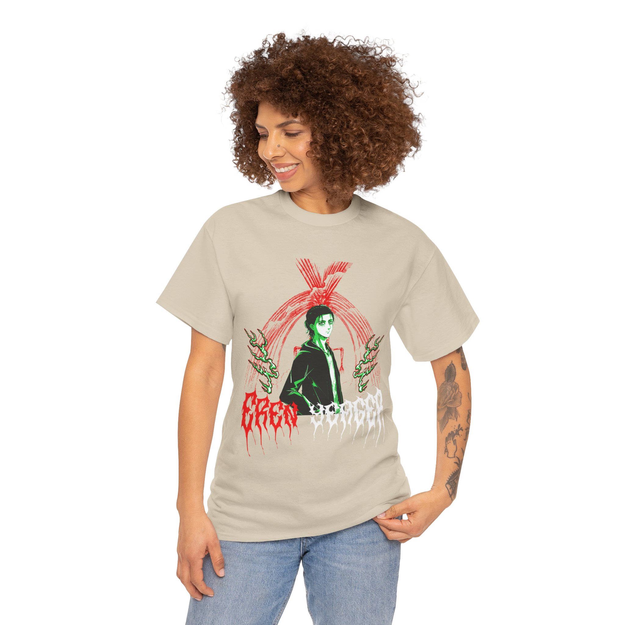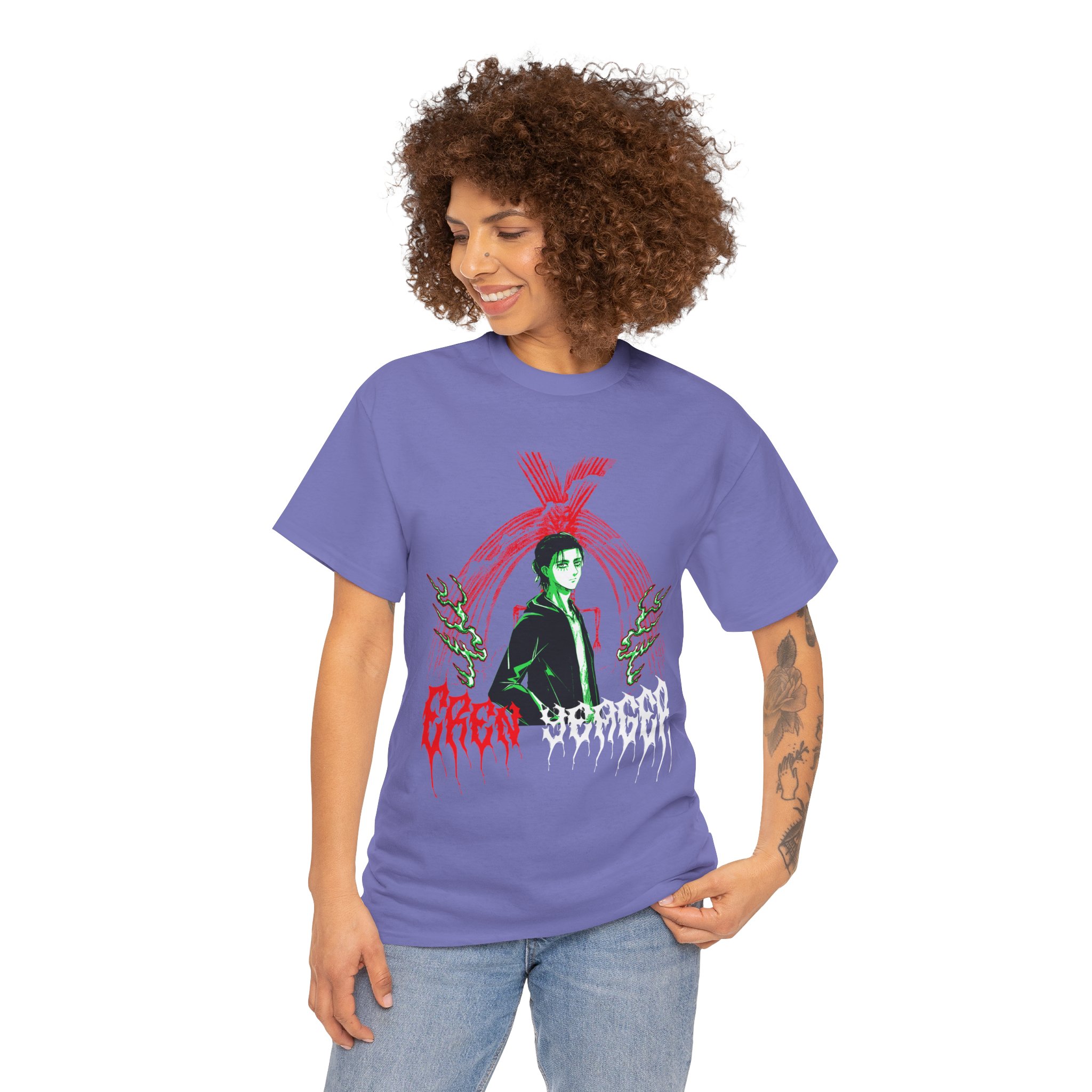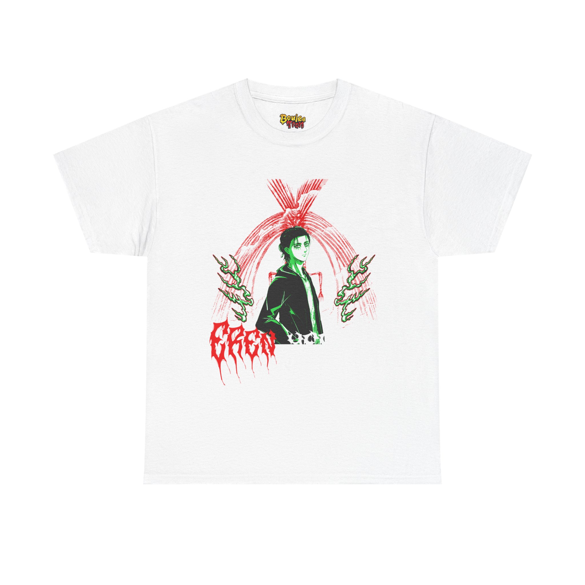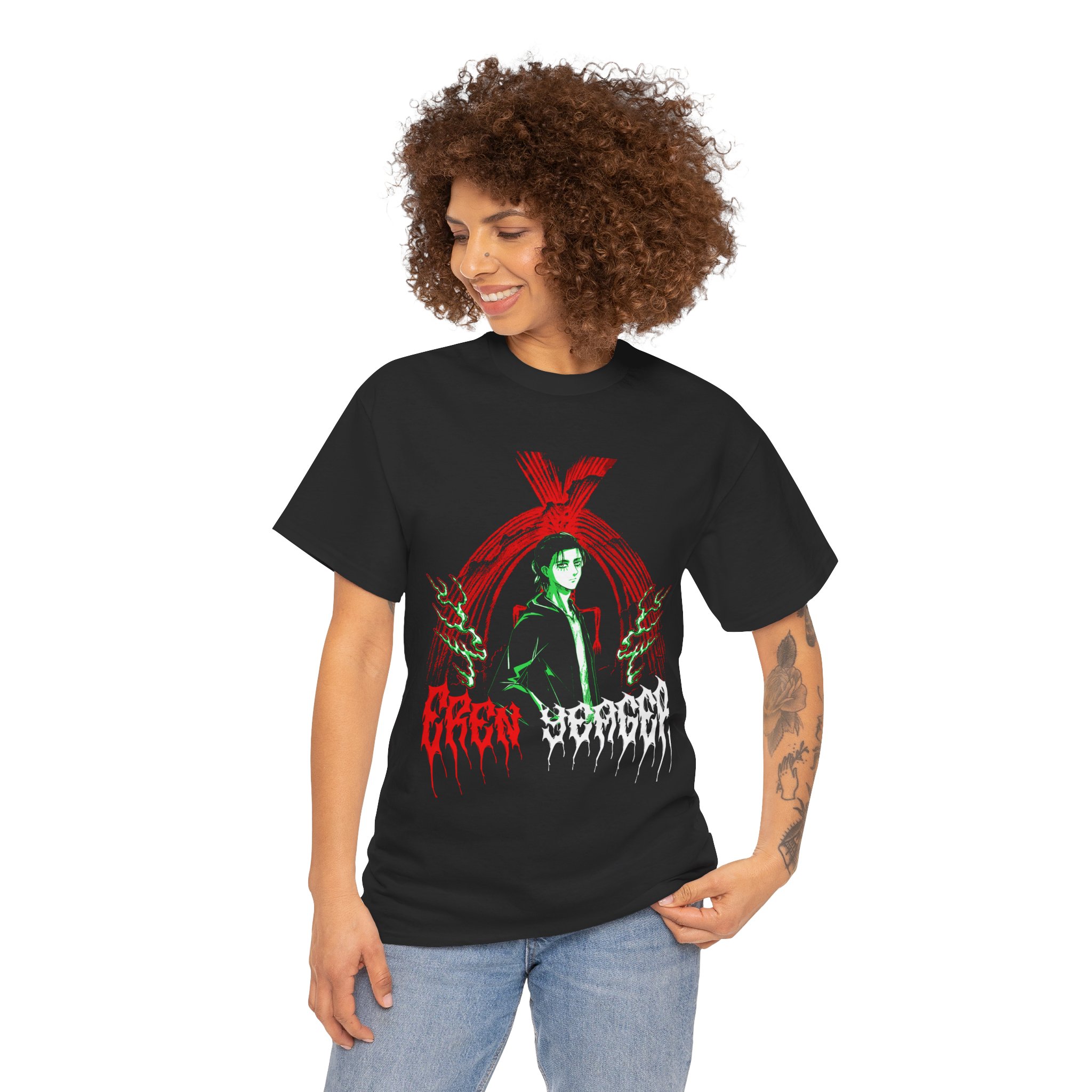 The Eren Graphic tee is a teeshirt that wears like a midnight soundtrack. The crisp white canvas puts a neon-infused graphic front and center: a lone, leather-jacketed figure in green tones beneath a hand-drawn, arching symbol and flanked by thorny botanical motifs. The design feels equal parts underground zine and late-night skate session — a quiet rebellion you can slip on and immediately inhabit. Lightweight but sturdy, it drapes relaxed and breathes easy, so it becomes something you reach for when you want an offbeat, expressive layer for shows, late hangs, or wandering city streets. The crew neck and clean lines keep the look simple, letting the art do the talking.