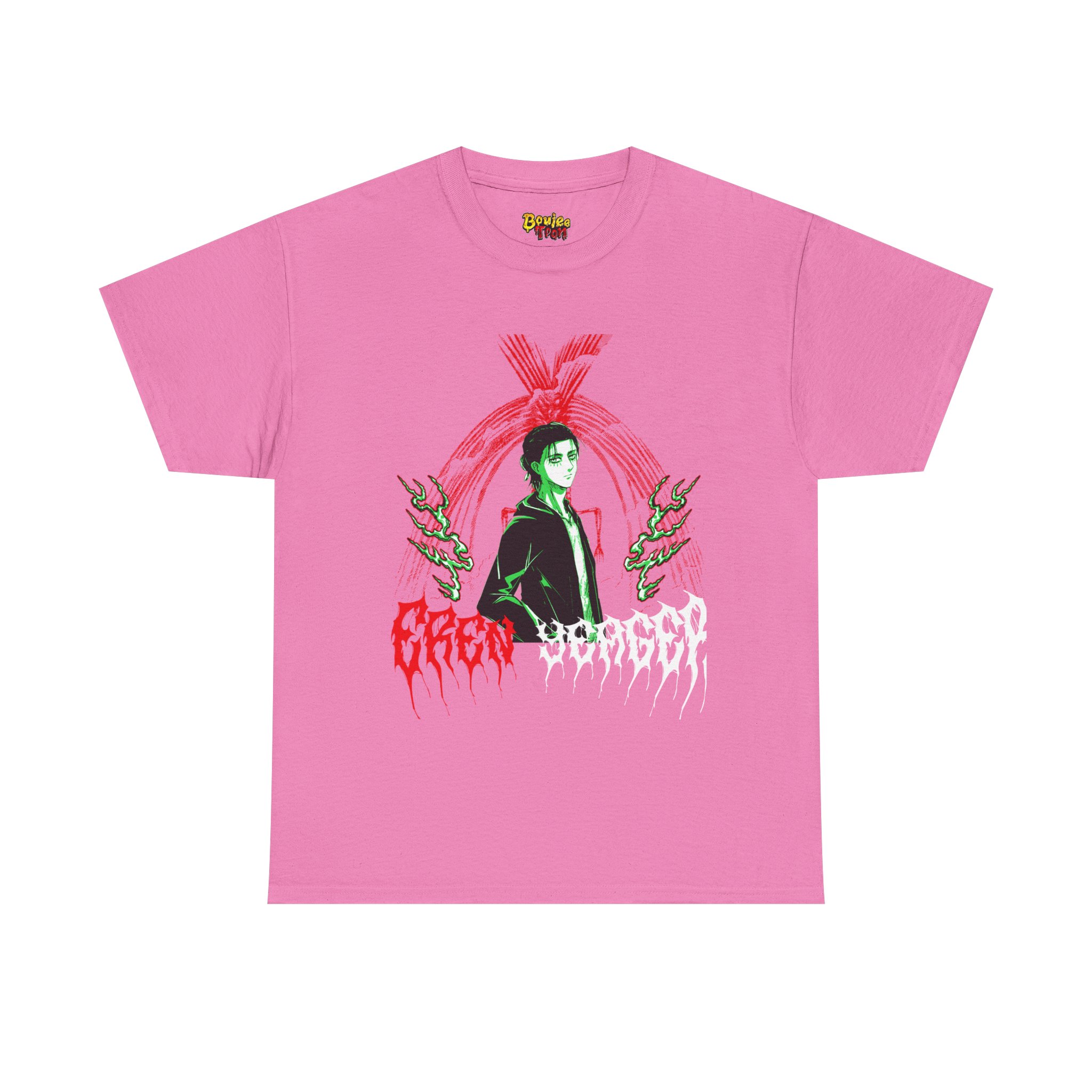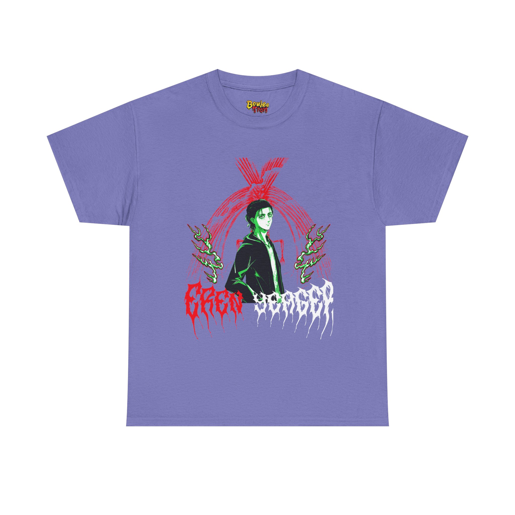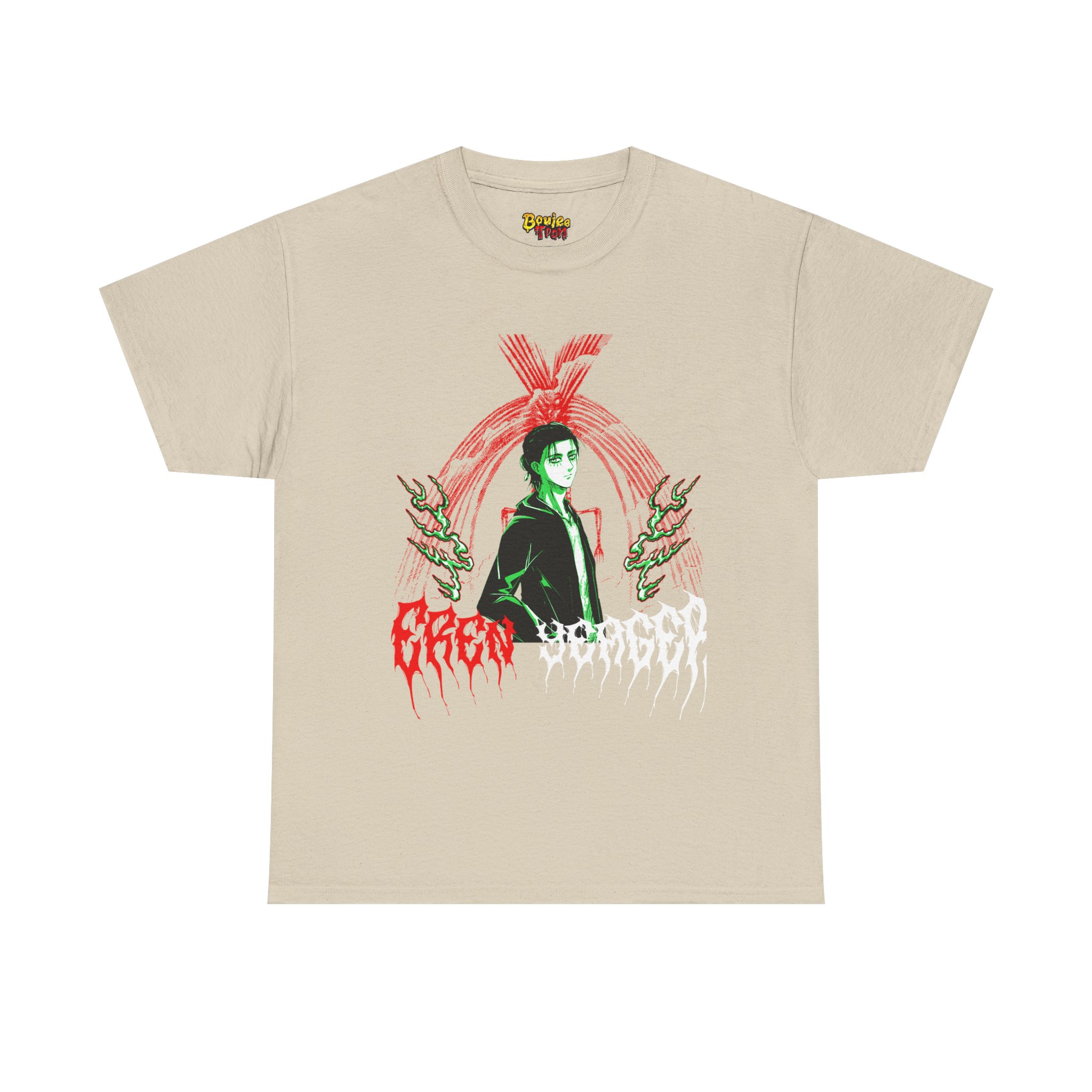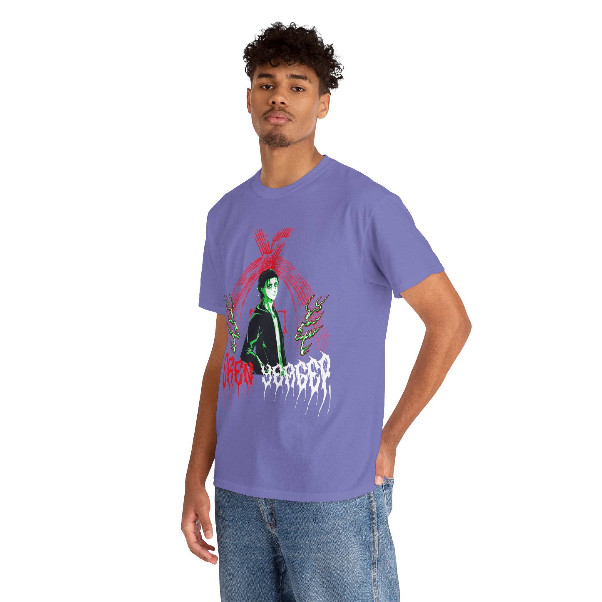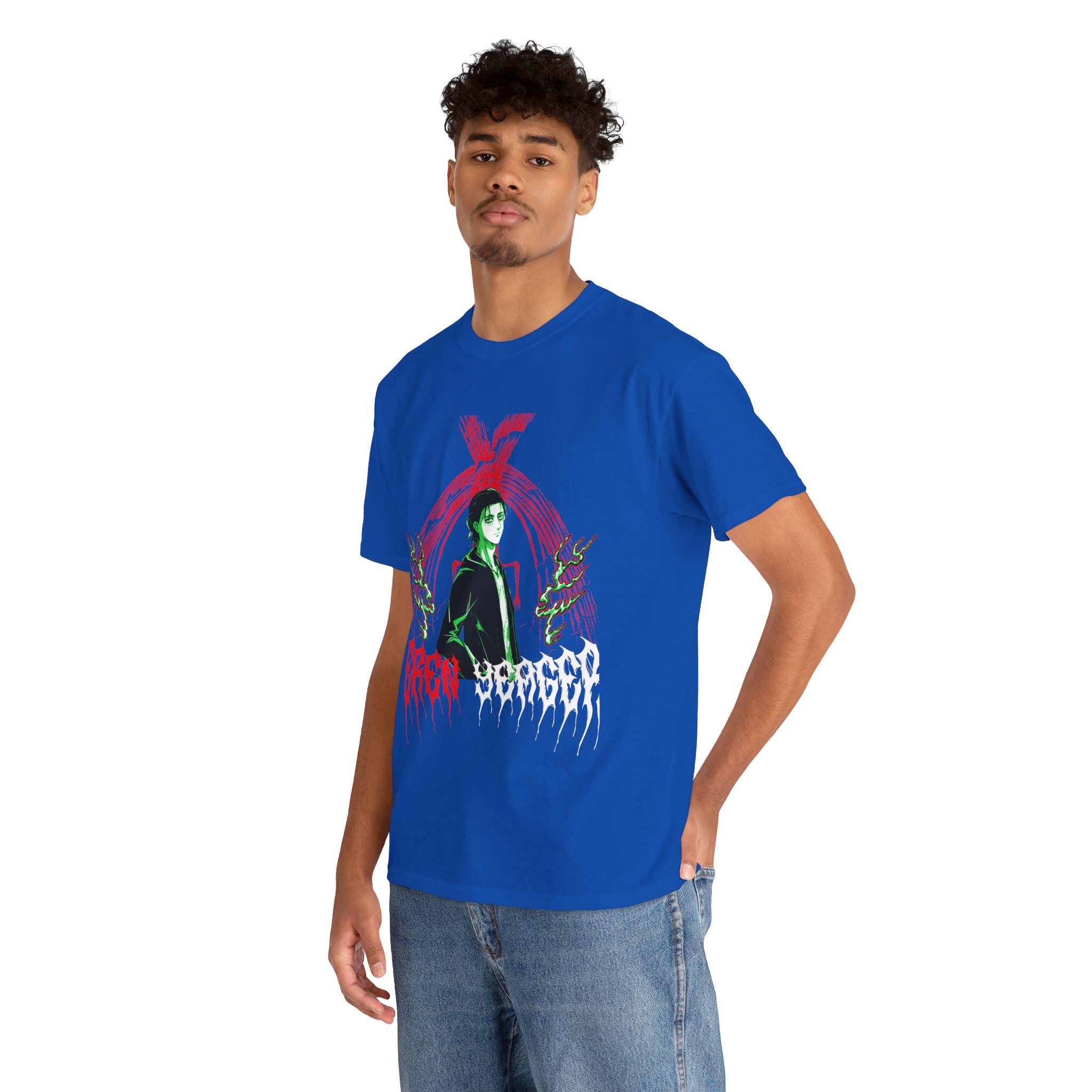 The Eren Graphic tee is a teeshirt that wears like a midnight soundtrack. The crisp white canvas puts a neon-infused graphic front and center: a lone, leather-jacketed figure in green tones beneath a hand-drawn, arching symbol and flanked by thorny botanical motifs. The design feels equal parts underground zine and late-night skate session — a quiet rebellion you can slip on and immediately inhabit. Lightweight but sturdy, it drapes relaxed and breathes easy, so it becomes something you reach for when you want an offbeat, expressive layer for shows, late hangs, or wandering city streets. The crew neck and clean lines keep the look simple, letting the art do the talking.