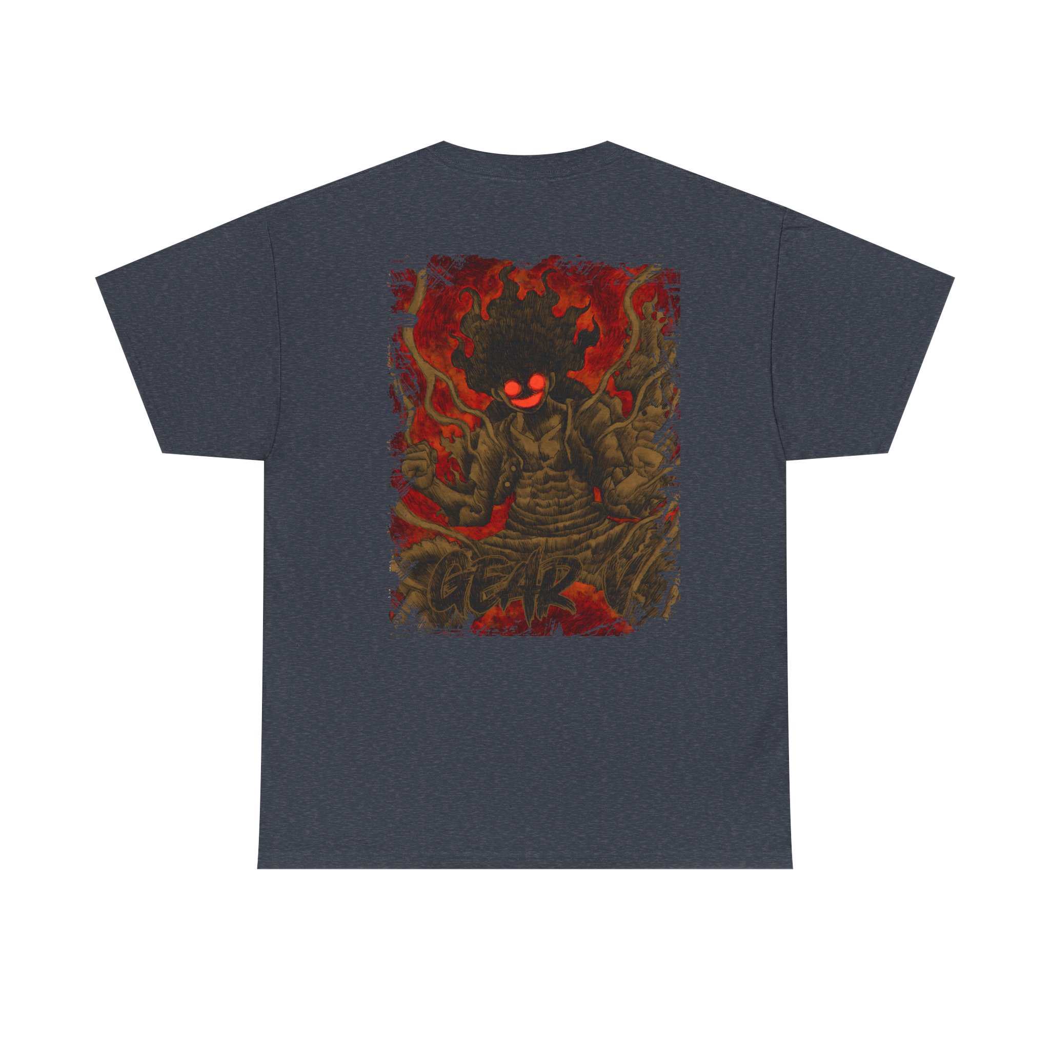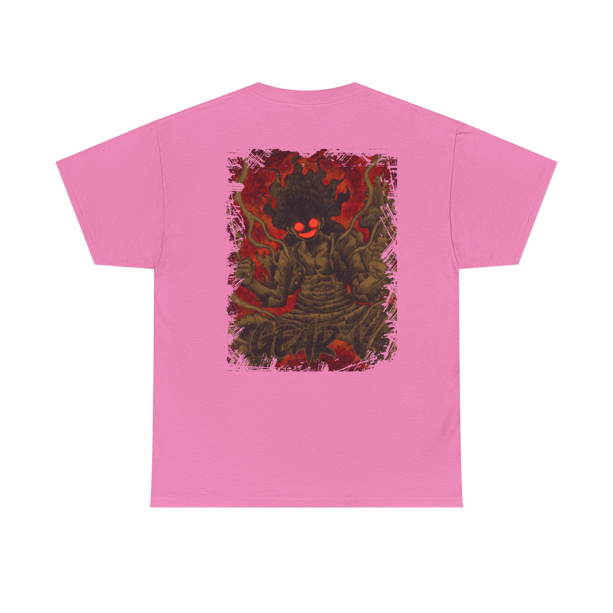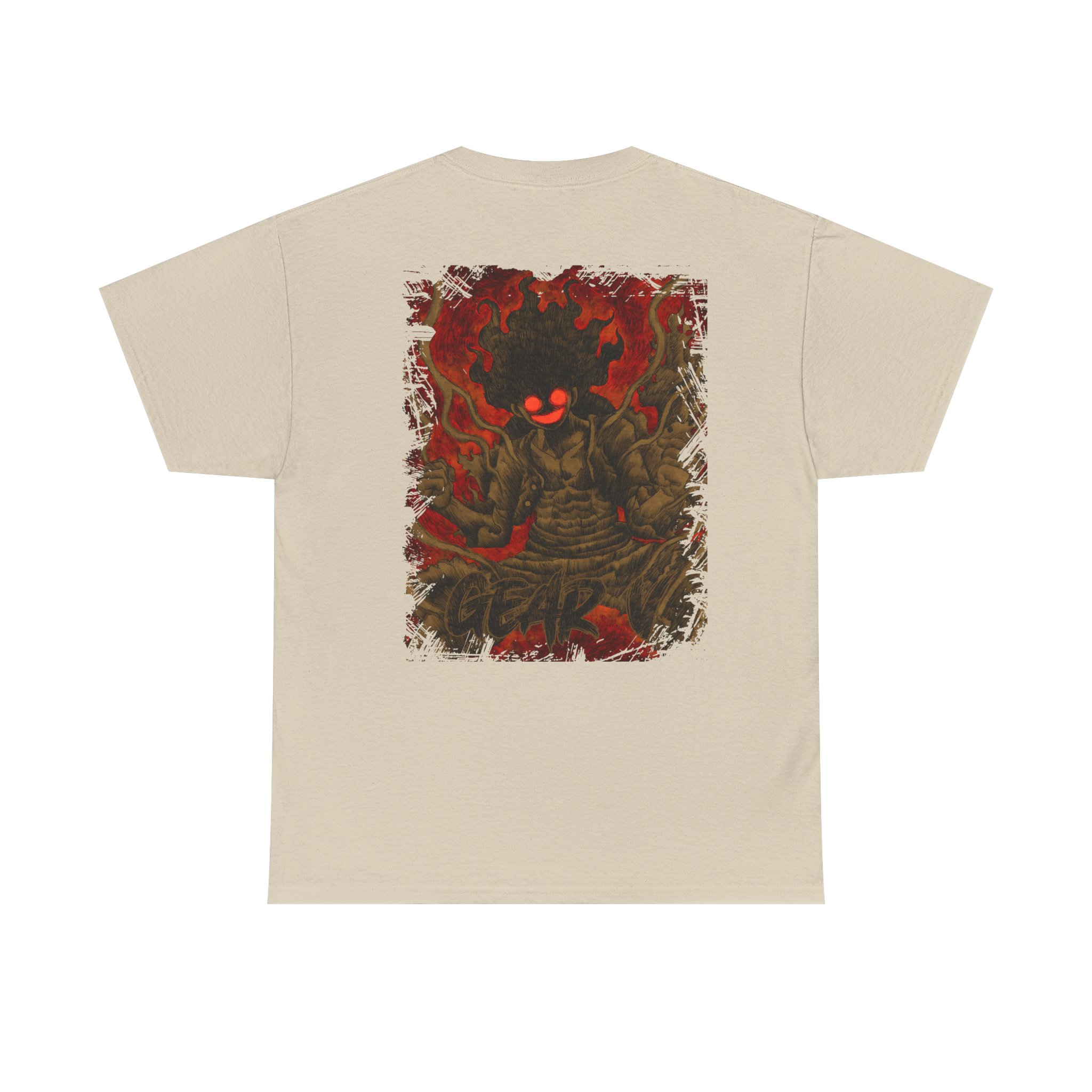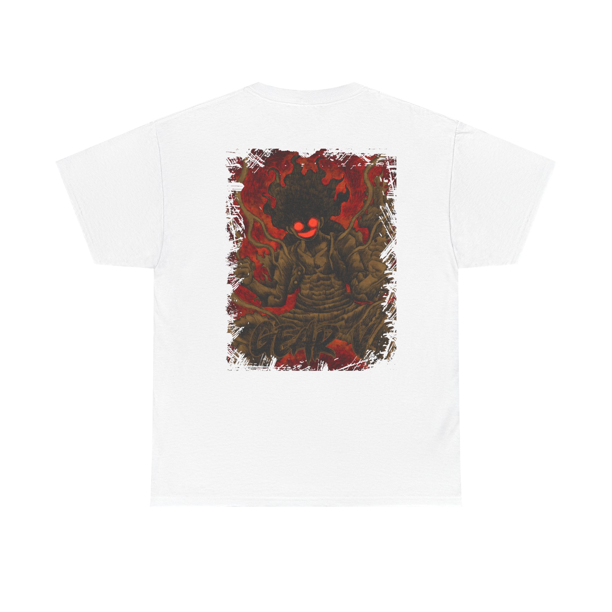 The Gear 5 Graphic Tee is a shirt that carries a dark, cinematic energy. The front bears a small, gritty logo at the chest; the back erupts in a detailed, sinister scene—deep reds, scorched browns, and molten highlights—creating a wearable piece of illustrated storytelling. It feels like an underground tour poster come to life: rough textures, hand-drawn strokes, and eyes that seem to glow when you step into dim light. Wear it to late-night shows, gallery openings, or when you want your outfit to speak in visual riffs rather than words. The weight and structure keep the print crisp over time while the classic crew silhouette makes it easy to layer under jackets or pair with worn-in denim.