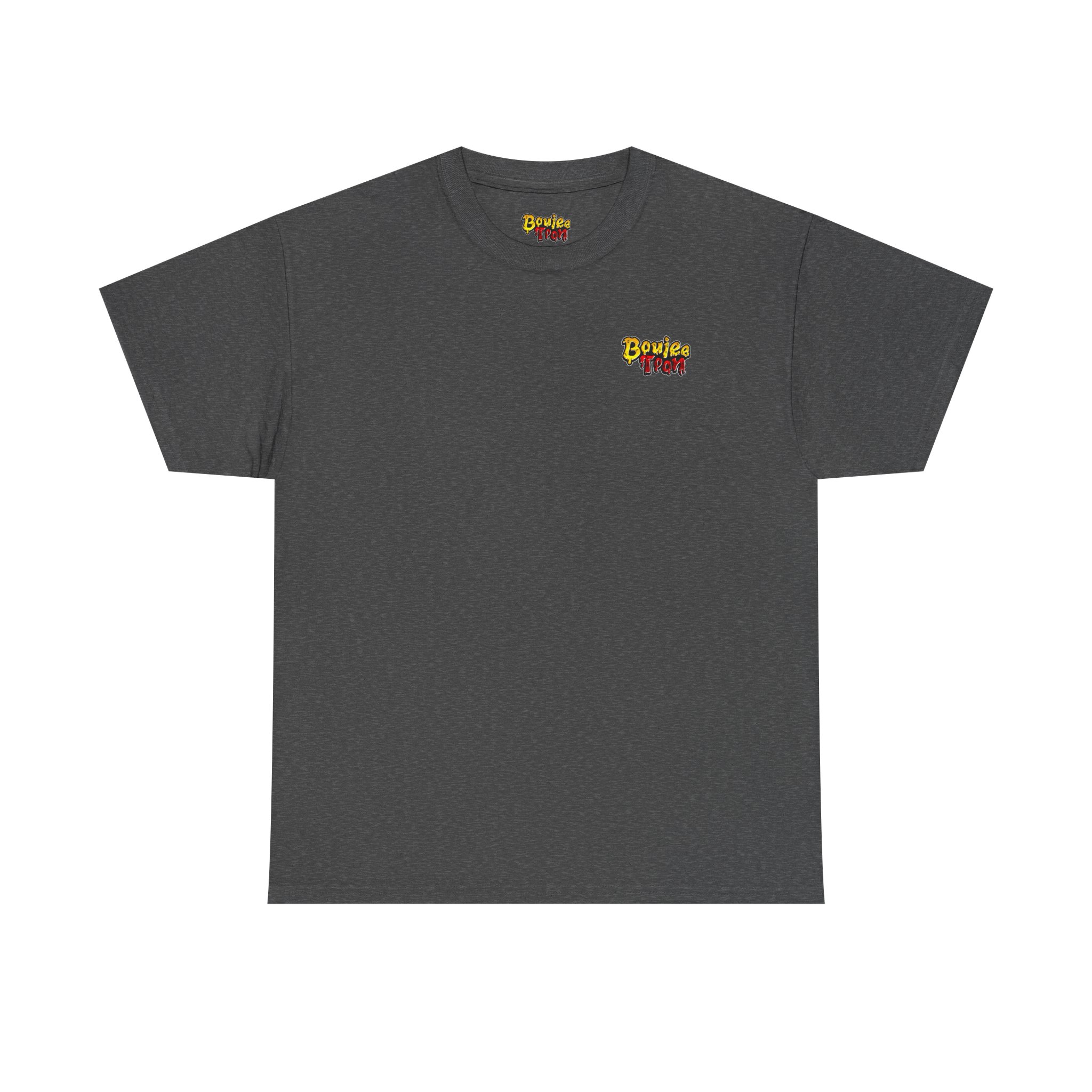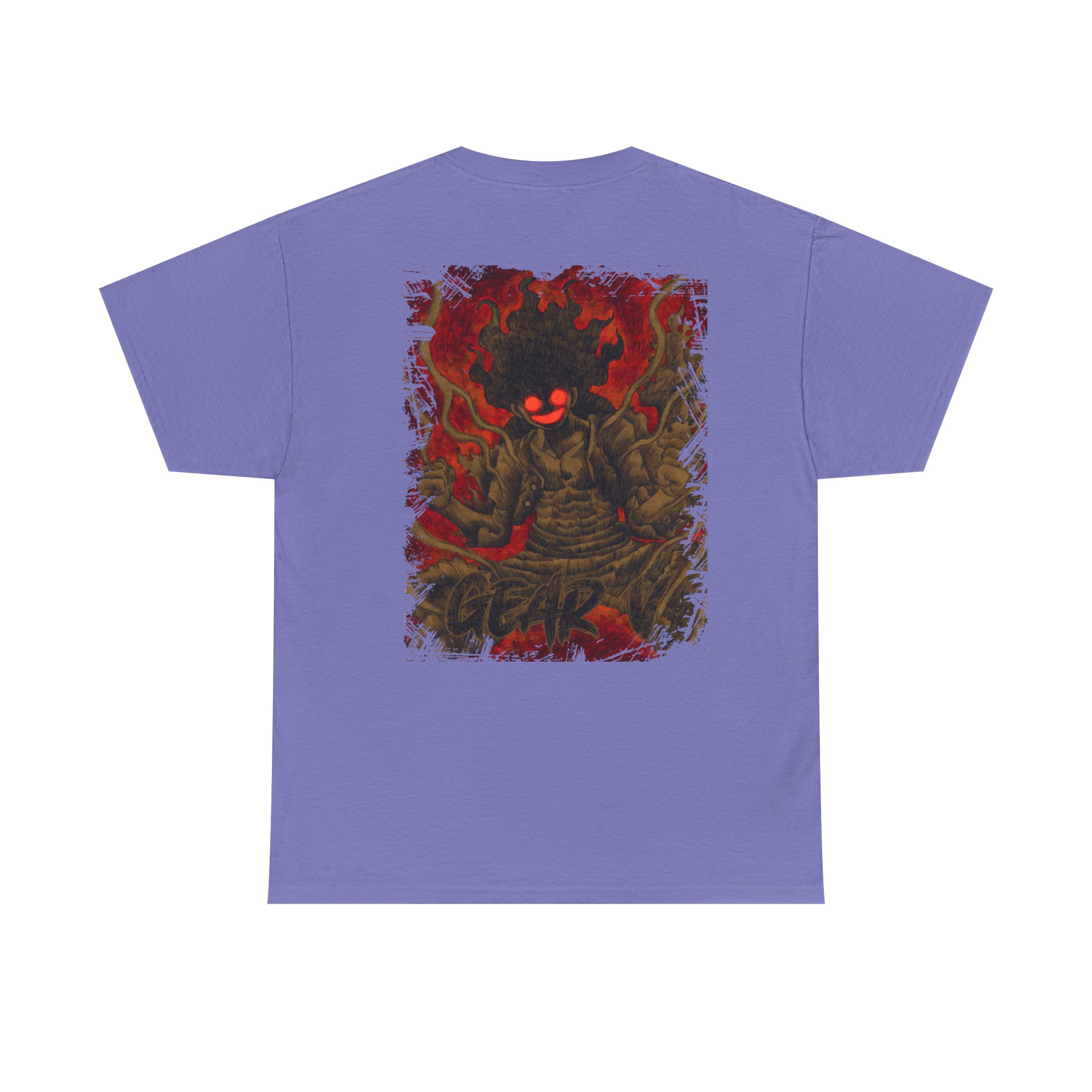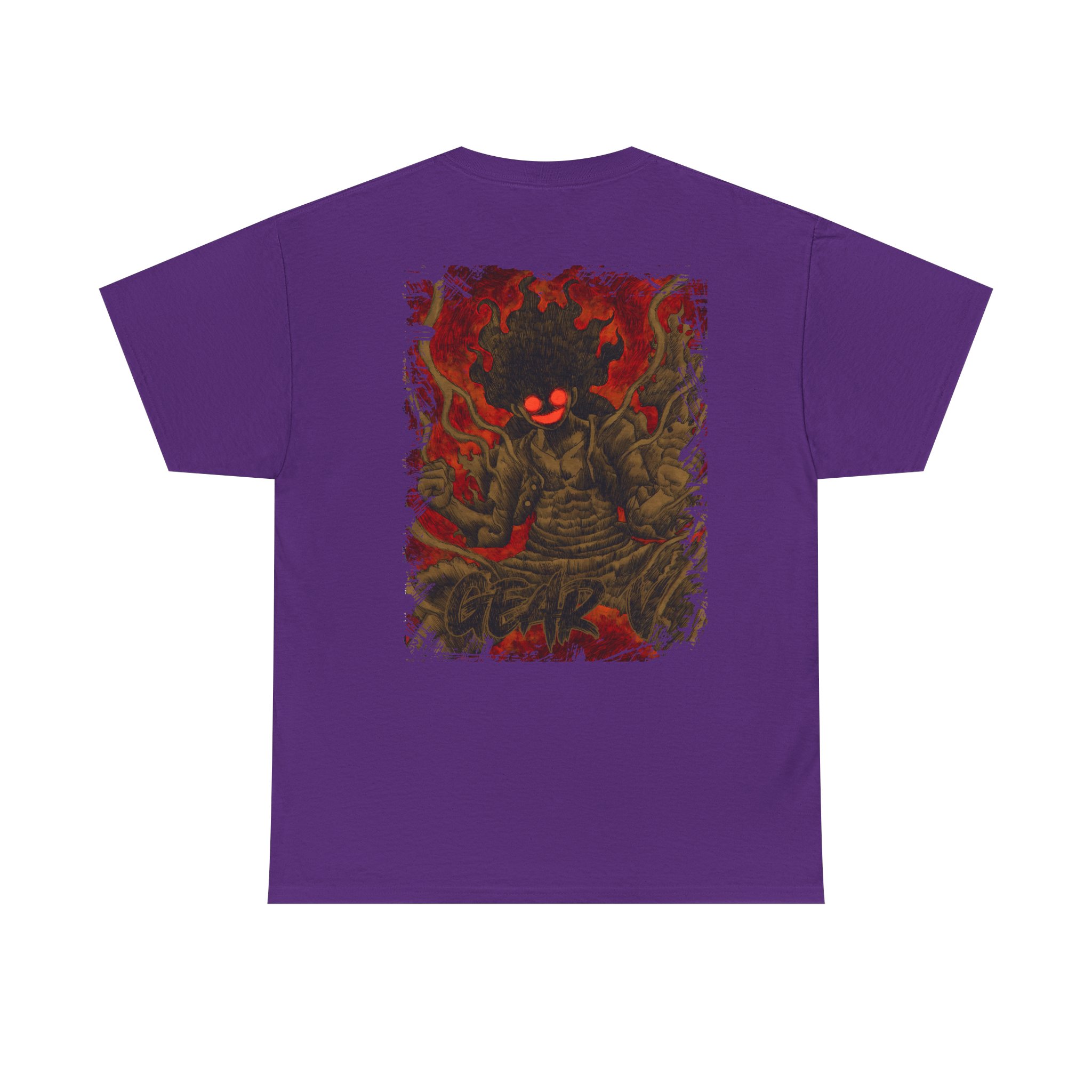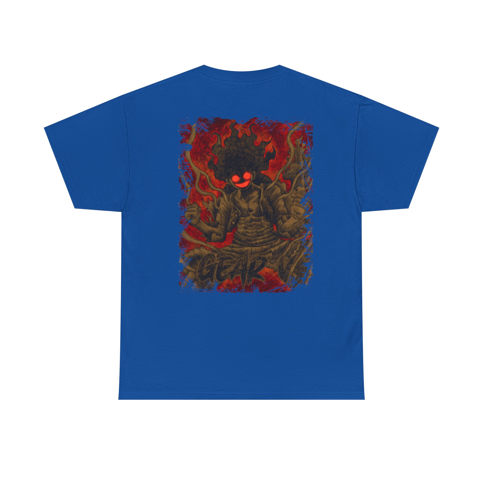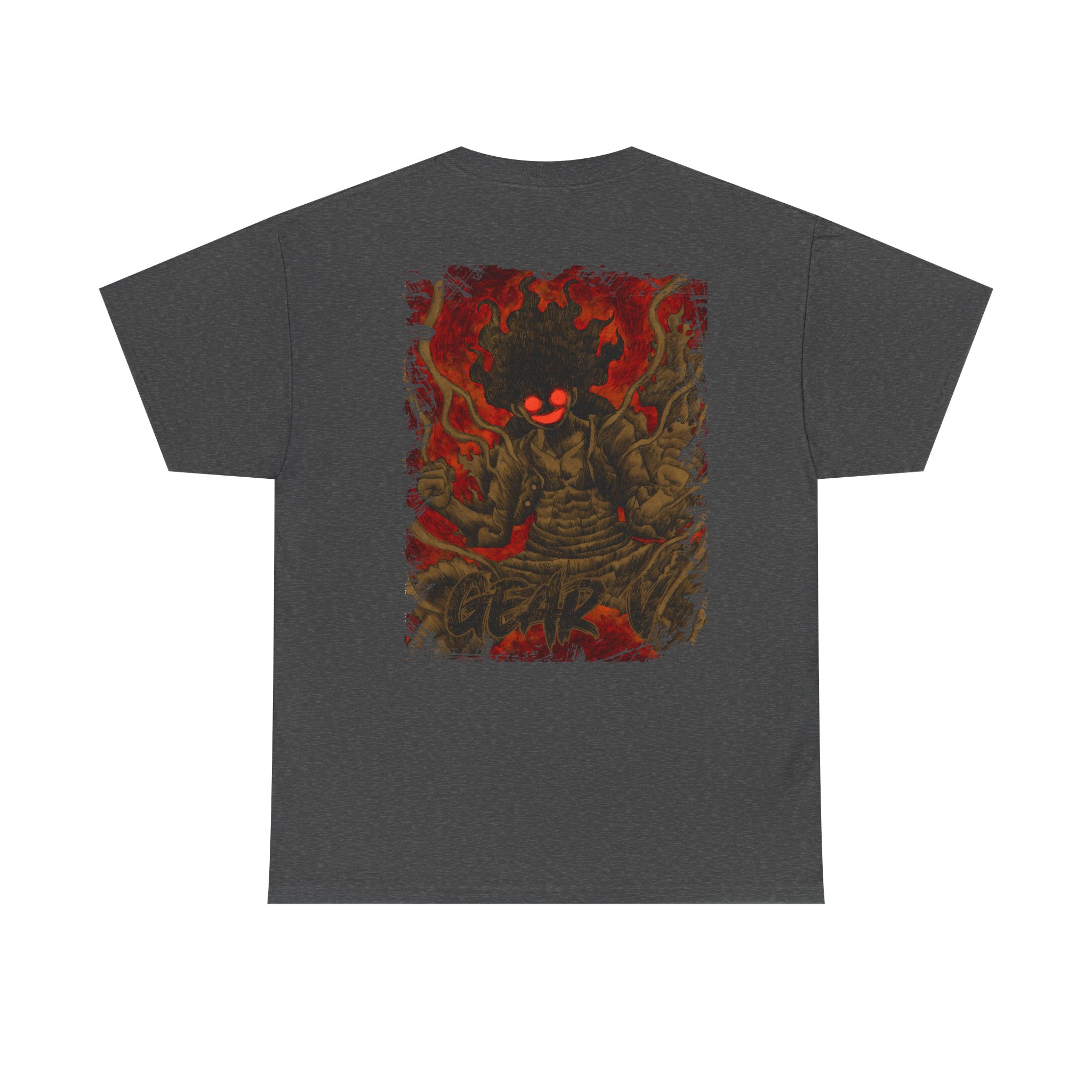 The Gear 5 Graphic Tee is a shirt that carries a dark, cinematic energy. The front bears a small, gritty logo at the chest; the back erupts in a detailed, sinister scene—deep reds, scorched browns, and molten highlights—creating a wearable piece of illustrated storytelling. It feels like an underground tour poster come to life: rough textures, hand-drawn strokes, and eyes that seem to glow when you step into dim light. Wear it to late-night shows, gallery openings, or when you want your outfit to speak in visual riffs rather than words. The weight and structure keep the print crisp over time while the classic crew silhouette makes it easy to layer under jackets or pair with worn-in denim.