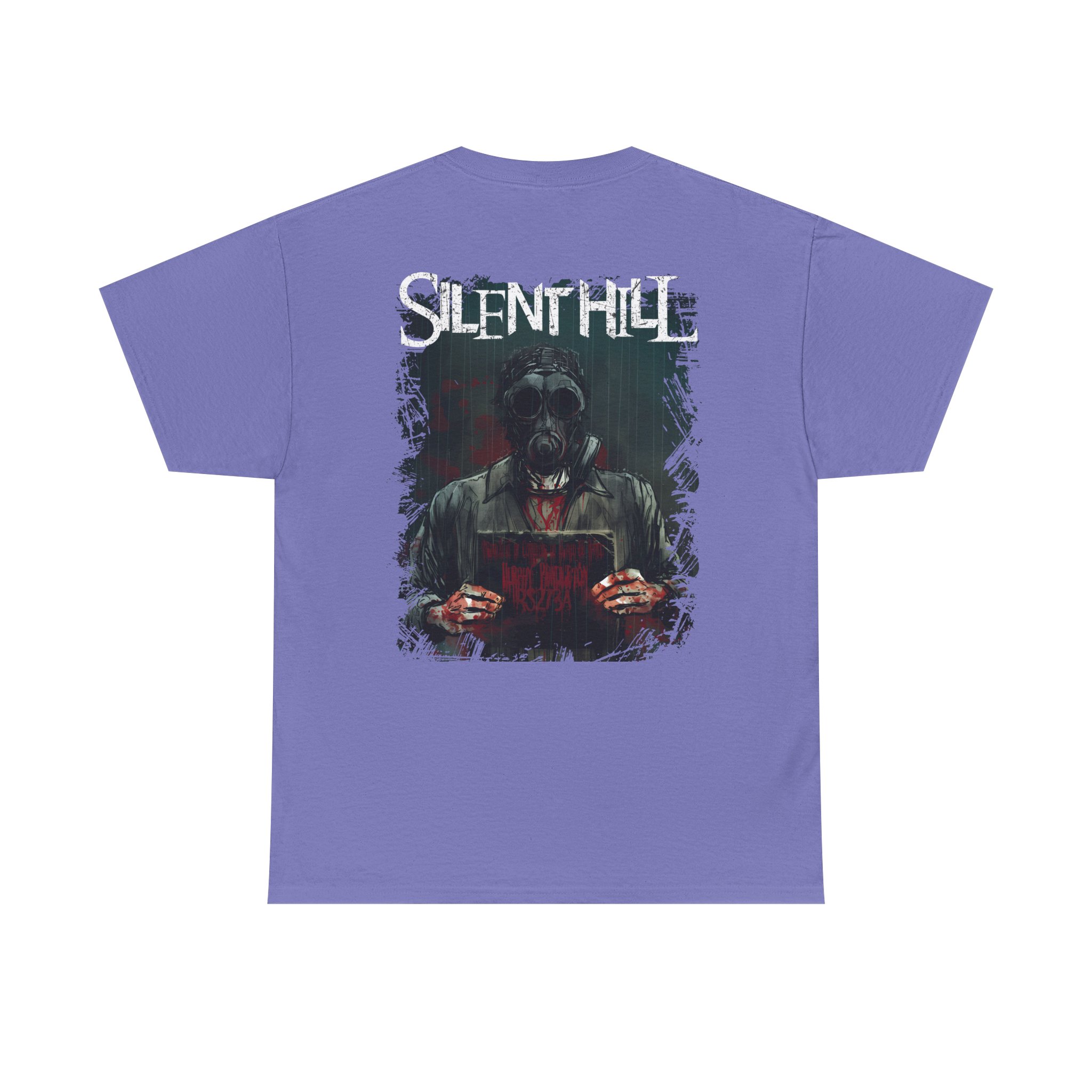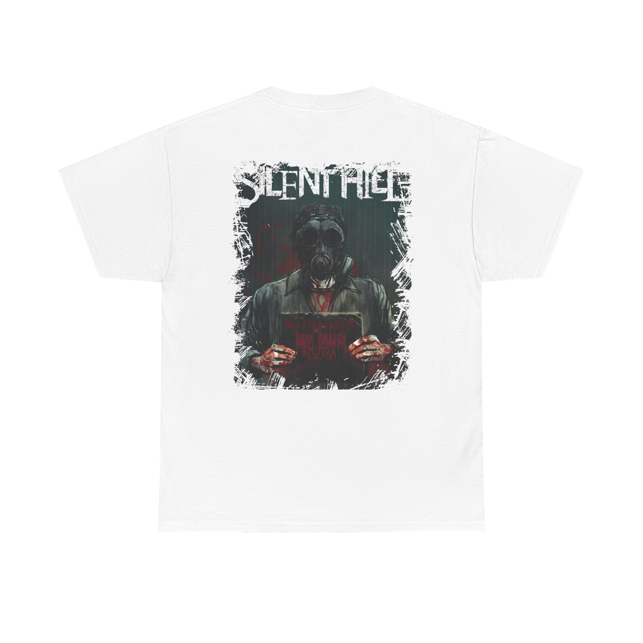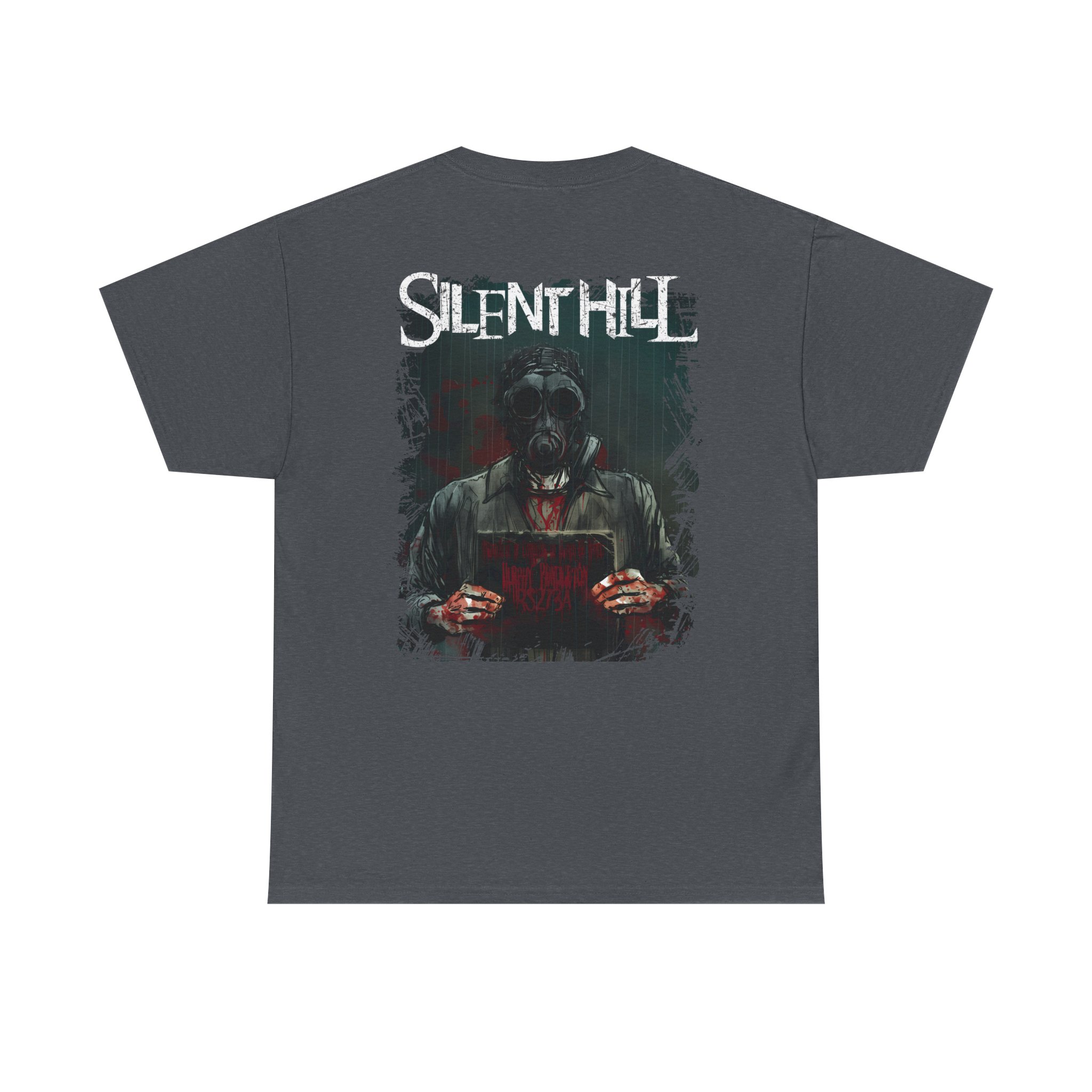 This Silent Hill Resident Graphic Tee carries a dark, cinematic energy — a quiet scream on soft fabric. The front chest shows a small, retro-styled logo while the back reveals a high-contrast horror scene: a masked, haunted figure framed by torn edges and distressed textures. Wear it to signal your love for eerie storytelling and cult horror aesthetics. It pairs with worn denim, layered flannels, and late-night cinema runs. The shirt sits comfortably with a relaxed crew neckline and holds its print detail wash after wash, so the image keeps its gritty intensity through the seasons.